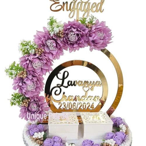 Unique Palette Personalized Engagement Ring Platter | Acrylic Bride & Groom Name | Sagai Ceremony Date | Premium Purple & Golden Theme with LED Lights | 2 Ring Holders (10x10x10 in)
