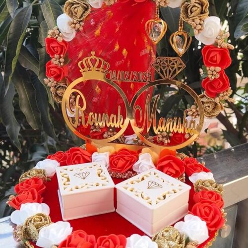 Unique Palette Personalized Engagement Ring Platter | Acrylic Bride & Groom Name | Sagai Ceremony Date | Red and Golden Theme Thali with 2 Ring Holders (10x10x10 in)